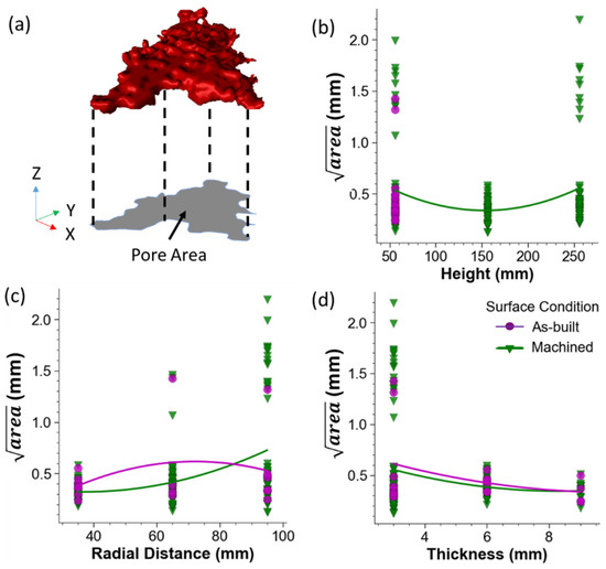 The severity of the pores can be defined in several ways including pore volume and the effective diameter. The largest pores in PBF are typically lack of fusion (LOF) voids that exhibit their largest dimension in-plane and exhibit high aspect ratios. As such, a description of the volume or diameter may underestimate the stress concentration. Spurious “rogue” defects that span many build layers also limit the applicability of these definitions. Originally proposed by Murakami [21] and applied to small defects in metallic materials [15], the root area of the pore is now among the prevalent methods for characterizing size and assessing their potential severity in AM [16,17,20]. An illustration concerning how the pore area is extracted is shown in Figure 6a.