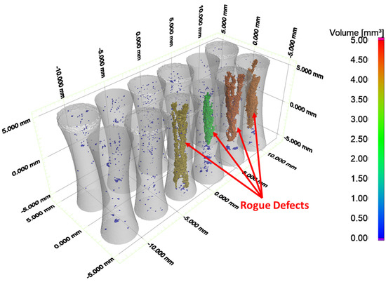XCT models of machined samples from low-level diameter (3 mm) and highlight of pores with diameter ≥ 0.1 mm. Example “rogue” defects are highlighted. Diameter is defined by the minimum encompassing sphere, which is the longest linear dimension of the pore.