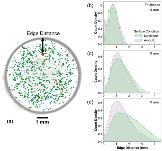 The pore location relative to a free surface is also important due to the stress-state and the time necessary for inherent damage to transition into a crack. Hence, the edge distance was defined and quantified by the shortest radial distance from the pore surface to the part surface in the plane perpendicular to the loading direction (Figure 8a). Histograms were constructed to assess the pore distribution as a function of the edge distance, for the three specimen sizes in Figure 8b,c. Regardless of thickness, the overall maximum pore concentration in the as-built condition was evident at an edge distance of approximately 0.7–1.1 mm from the free surface. A local maximum in the pore density was noted near the surface (<0.2 mm from the surface) in the 3- and 6-mm-thick specimens of the as-built condition. Machining removed the near-surface pores, which is evident from the absence of this peak in the histograms. Interestingly, a local maximum was not evident in the histogram for the 9-mm-thick specimens (Figure 8d).