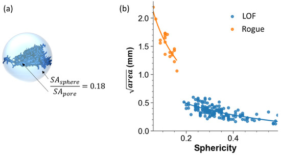 Sphericity of internal pores and voids. (a) Example of a LOF defect and the calculated sphericity according to Equation (3). (b) Pore size distribution in terms of the as a function of sphericity. Note the separation of the rogue and LOF defects.