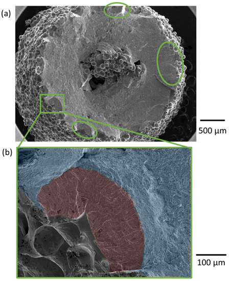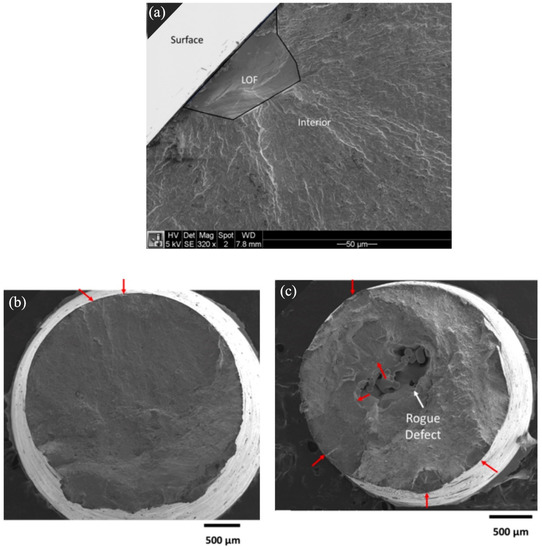 An evaluation of the fracture surfaces of exemplary specimens was conducted to determine the origin of fatigue failure. A micrograph of the fracture surface for an as-built specimen with rogue defect is shown in Figure 10a. Despite the presence of a rogue defect that occupied up to 10% of the fracture surface area, the failure origins of the as-built specimens with these defects were found to be at the exterior surface.