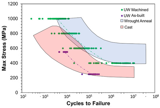 Casting and wrought forming are the primary manufacturing processes for Ti6Al4V components in aerospace. One goal for metal AM is to reach an equivalent or superior performance to that achieved by wrought forming. A comparison of the fatigue data from the DOE and that from published sources for cast and wrought conditions is shown in Figure 12. Results for the as-built condition fall within the region of fatigue life data reported for casting [23]. While results for the machined condition are superior to the cast condition, they are not consistent with that for wrought form metal. Furthermore, a portion of the machined data falls within the region of cast metal, which corresponds to the EBM specimens with rogue defects. Assuming process control could eliminate rogue defects, then the fatigue life responses for the machined condition are comparable to that of Ti6Al4V manufactured by wrought forming and in the annealed condition. Further improvements could be garnered by employing a post-process treatment such as solution heat treating and aging (STA) or hot isostatic pressing (HIP) [1,24].