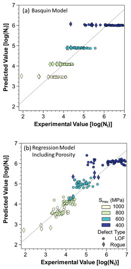 Comparison of predicted values against experimental values for (a) the Basquin model and (b) the linear regression model that accounts for porosity characteristics (Equation (5)).