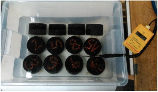 For testing the frost resistance on freezing and thawing compacted asphalt mixtures, Marshall samples were made from ACO 11 + asphalt mixture (asphalt for surface course, Dmax = 11 mm). The Standard prescribed 25 freeze–thaw cycles, 50 cycles and 75 cycles were added. Subsequently, the samples were divided according to the average bulk density into four groups: air, 25 freeze–thaw cycles, 50 freeze–thaw cycles, and 75 freeze–thaw cycles. The absorption of all samples was determined; see Figure 1. Then, the samples were subjected to a given number of cycles of freezing (minimum 4 h at −20 °C ± 2 °C) and thawing (minimum 4 h at room temperature +20 °C ± 2 °C, in saline solution); see Figure 2.