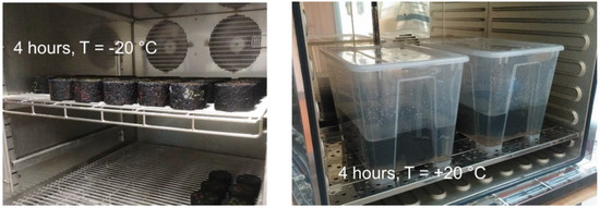 For the experiment itself, it was necessary to simulate conditions as realistic as possible. This also applied to the design of the number of freeze–thaw cycles. The average number of frost days per year (days when the temperature drops below 0 °C during 24 h) in Slovakia is 115 days [28,32], as a long-term average for the 1931–1990 period. In the Czech Republic, it is 112 days [33], as a long-term average for the 1961–1990 period. Due to the diversity of the two countries, the number of frost days within the republics is different. The lowlands have on average 90–100 frost days, but it can be 160 frost days in the mountain valleys. After 1990, due to general warming, all characteristics shifted by about 1 °C.