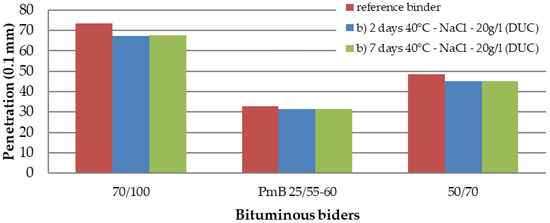 Samples of standard used paving grade bitumen 50/70 and 70/100, and polymer-modified bitumen PMB 25/55-60 for testing penetration [34], elastic recovery [35], and softening point [36] were placed in sodium chloride solution and placed in an oven at 40 °C for 2 and 7 days. This test temperature was chosen to accelerate the action of the salt solution on the binder. The reference samples were placed in an oven without a salt solution. Thus, the results were not affected due to the different aging of the binder.