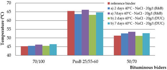 The softening point results have different behavioral tendencies. Gradually, there is a slight increase in the softening point between the second and seventh day of the effect of the salt solution. For the binder 70/100, the total change was 1.1 °C and 1.2 °C, respectively, a change of 2.5%. For the binder 50/70, there was an increase of 2.3 °C, a change of 4.4%. For the PMB binder, in one case, there was an increase of 0.6 °C and a decrease of 0.8 °C in the other case. It can be stated that the saline solution does not affect this property of the PMB binder.