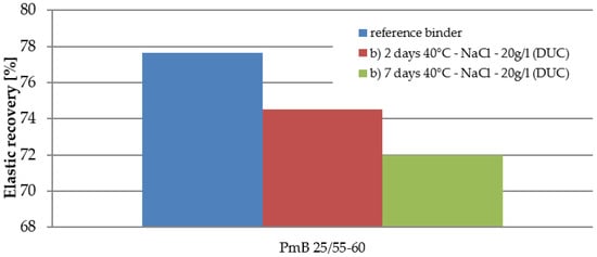 Elastic recovery was determined only for the PMB binder. After two days in the saline solution, there was a decrease of 3.1%, after another five days a further 2.5%. The total change in elastic recovery was 5.6%, i.e., the change was about seven percentage points.