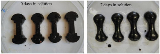 Additionally, in Figure 6, the change in the shape of the test samples (elastic recovery test) due to the effect of saline solution can be seen.