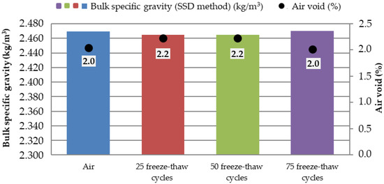 Bulk specific density and air void of the ACO 11 + mixture depending on the number of freeze–thaw cycles.
