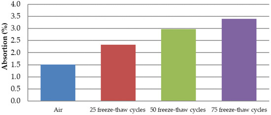 Marshall samples were into four groups divided: air (reference: 0 freeze–thaw cycles), 25 freeze–thaw cycles, 50 freeze–thaw cycles, and 75 freeze–thaw cycles. All four groups had approximately the same bulk specific gravity (Figure 7). Air void value was 2.0% for the “Air” and “75 freeze–thaw cycles” groups of samples and the value of 2.2% for the “25 and 50 freeze–thaw cycles” groups of samples. The increasing number of freeze–thaw cycles increases the absorption value from 1.5% to 3.4% (Figure 8): “Air” group samples—values of 1.1–1.9%; “25 freeze–thaw cycles”—values of 2.3–2.4%, “50 freeze–thaw cycles”—values of 2.8–3.3%; and “75 freeze–thaw cycles”—values of 2.9–4.2%. Relationship between the absorption of asphalt and the number of freeze–thaw cycles is in Figure 9. Marshall stability, flow value, and Marshall stiffness [38] (Figure 7 and Figure 10) were measured, and the change in stiffness modulus [39] is shown in Figure 11, Figure 12, Figure 13 and Figure 14. The results of both tests show identical trends. The increasing number of freeze–thaw cycles negatively affects the deformation characteristics of the asphalt mixtures. The Marshall stability decreased from the original value of 10.8 kN to 9.07 kN due to freeze–thaw cycles, which is a decrease of about 16%. The flow value has the opposite trend. The Marshall stiffness decreased from the original value of 3.13 kN/mm to 2.00 kN/mm. It is a decrease of about 36%.
