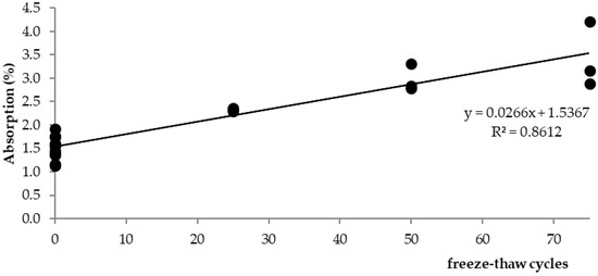 Relationship between the absorption of the mixture and the number of freeze–thaw cycles.