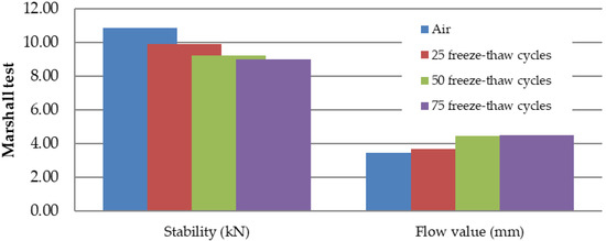 Marshall stability (kN) and flow value (mm) depending on the number of freeze–thaw cycles.