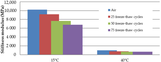 The decrease in strength and deformation characteristics occurs significantly after 50 and 75 freeze–thaw cycles. The increasing number of freeze–thaw cycles negatively affected the deformation characteristics of the asphalt mixture. Due to the freeze–thaw cycles, the Marshall stability decreased by about 16%, from the original value of 10.8 kN to 9.07 kN, and the Marshall flow value increased by about 30%—from the original value of 3.47 mm to 4.50 mm. The stiffness modulus decreased by about 32% at 15 °C, from the original value of 10,219 MPa to 6800 MPa, and the stiffness modulus decreased by about 31% at 40 °C, from the original value of 979 MPa to 666 MPa.