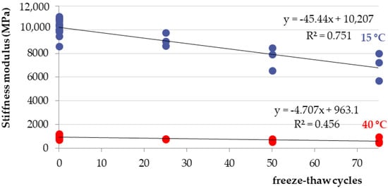 Relationship between stiffness modulus at the test temperatures of 15 °C and 40 °C and the number of freeze–thaw cycles.