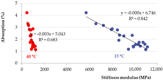 Relationship between stiffness modulus at the test temperatures of 15 °C and 40 °C and absorption of test samples.