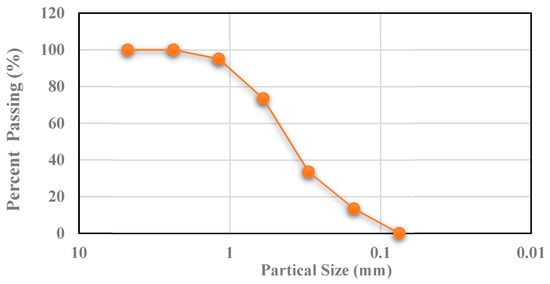 The first stage involved finalizing the design of the UHPC mixture and developing a new casting method using locally available materials for producing UHPC. The hardened mechanical properties, including compressive strength, were investigated for each of the trial mixes. In addition to the well-known aspect of the high compressive strength of UHPC, the focus was on achieving a flexural strength of about 30 MPa. Materials used for UHPC included cement, micro silica, fine aggregate, steel fibers, and superplasticizer. Ordinary Portland cement (OPC) Type I according to ASTM C 150 [37] with a specific gravity of 3.15 was used. The specific gravity and absorption values of fine aggregates were 2.56 and 0.4%, respectively. The particle size distribution of fine aggregate (FA) used in this paper is shown in Figure 1. The specific gravity and specific surface area of micro silica (MS) used in this study were 2.25 and 20,000 cm2/g, respectively. Table 1 shows the physical and chemical characteristics of raw materials used in this study. Copper-coated micro-steel fibers (straight steel-wire) used in this work were supplied through the local agency in Najran city, Saudi Arabia. The length, diameter, aspect ratio, and volume fraction of micro-steel fibers were 13 mm, 0.2 mm, 65, and 2%, respectively, with a maximum tensile strength of 2500 MPa. Table 2 presents the steel fiber specifications. A high-range water reducing agent (superplasticizer), Glenium®110M, was sourced from a local company (BASF), Najran, Saudi Arabia, of medium to dark brown colored liquid with a specific gravity of 1.065. The water to cementitious ratio of 0.15 was kept constant. The final mixture resulted in about 160 MPa compressive strength (2-inch cube) and flexural tensile strength of over 30 MPa. The materials used for the normal weight concrete (NC) include OPC, FA, coarse aggregate (CA) with a specific gravity of 2.65 and 1% absorption capacity, and tap water. Water to cement ratio of 0.42 was used to achieve a cylindrical compressive strength of about 40 MPa.