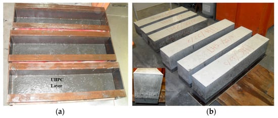 (a) UHPC layers prior casting the NC, (b) Hybrid NC-UHPC beams before testing.