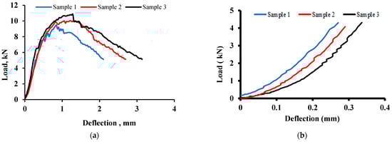 Typical load–deflection plot for (a) UHPC prisms under flexure and (b) UHPC prisms without steel fibers.