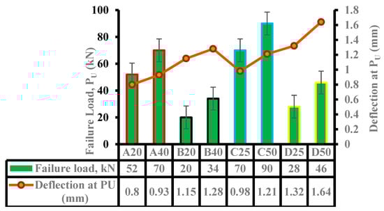 Flexural load tests were conducted on hybrid NC-UHPC with four different spans (Groups A to D) ranging from 630 mm to 1100 mm, and each span having two different UHPC thicknesses. Groups A and B have a thickness of 20 mm and 40 mm, whereas Groups C and D have thicknesses of 25 mm and 50 mm. The details of spans, failure load, and moment capacity of three identical specimens are shown in Table 6. The average results of three specimens for maximum flexural failure load, PU, and the corresponding deflection recorded at mid-span for all hybrid beam specimens are presented diagrammatically in Figure 6.