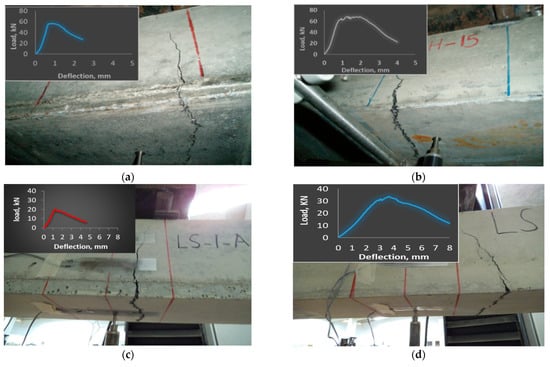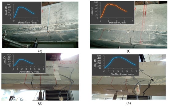 Deflection in the beam was measured with a linear voltage displacement transducer (LVDT) supplied by Tokyo Sokki Kenkyujo-Co., Ltd. (Tokyo, Japan). The LVDT was located at the bottom side of the beam in the central portion at mid-span (Figure 3b). Four strain gages were positioned at four different locations, on top and bottom surfaces and at 1/3 and 2/3 of the beam depth on the vertical side of the beams to observe the strain distribution across the depth (Figure 3b). Strain gauges of 60 mm gauge length type PL-60-11-3LJCT-F supplied by Tokyo Sokki were used in this study. All hybrid beam specimens were tested at a loading velocity of 0.5 mm/min. The deflection and strain values were recorded for every step of loading. The load–displacement path after the peak load was also recorded to observe softening behavior. In addition to the measurement of the strain and deflection, crack propagation, as well as the mode failure of all specimens, were also noted.