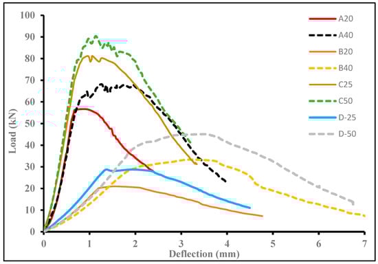 Load–deflection curve for all hybrid beams under flexural loading.