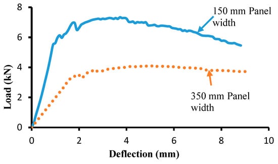 In order to confirm the findings related to the influence of specimen size on the flexural capacity of beams with UHPC, panels of two sizes, 600 mm × 30 mm × 150 mm and 600 mm × 30 mm × 350 mm (height × depth × width), were cast and subjected to four-point flexural load over a clear span of 500 mm. The load–deflection response of the UHPC beams is shown in Figure 9. The average peak load of three specimens for a 150 mm wide specimen is 7.2 kN, which is reduced to about 4 kN for a 350 mm wide specimen. Both specimens show significant ductility after the peak load. The load capacity decreases by about 45% when the width of the UHPC beam is increased.
