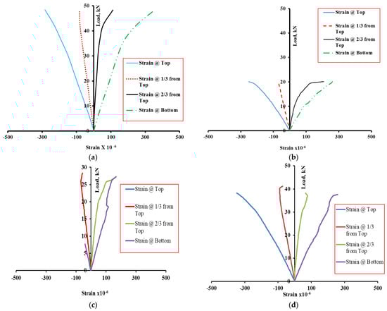 Load–strain curve: (a) beam A20, (b) beam B20, (c) D25, and (d) D50.