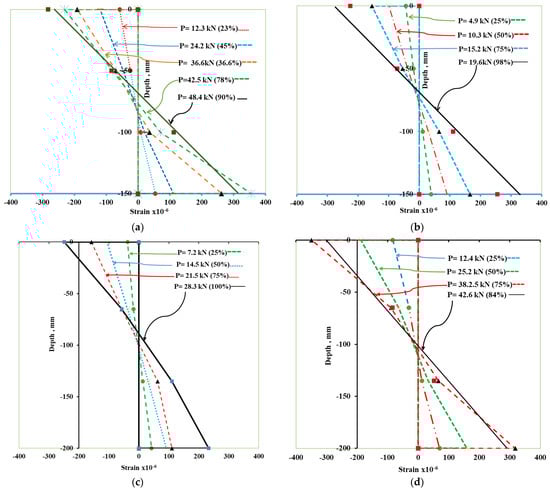Strain diagram through the depth of hybrid beam: (a) beam A20, (b) beam B20, (c) beam D25, and (d) Beam D50.