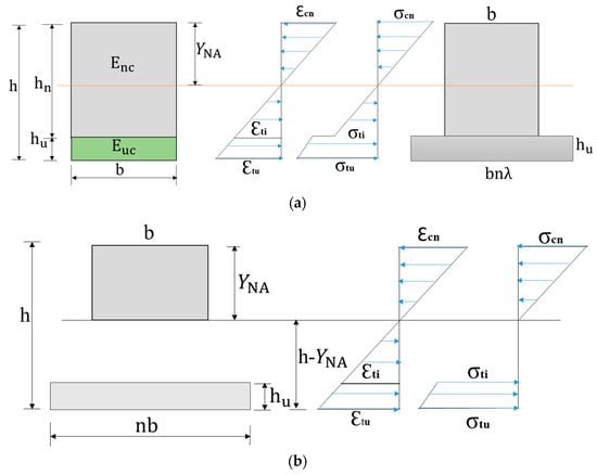 From the experimental program conducted, it was observed that cracking in the beams may commence either at the bottom of the UHPC layer or at the bottom of the NC layer. No shear cracking was observed at the interface of NC-UHPC, which was reported in [34]. The computation of the neutral axis and the moment of inertia (MI) of the hybrid sections for the computation of stresses depends on the state of cracking. Just prior to the development of cracking either in the NC or the UHPC layer, the uncracked MI (Iuc) can be computed in which both NC and UHPC are effective (Figure 12a). If the cracks develop in the NC layer and the UHPC layer is uncracked, then MI is (Icrn) in which NC is cracked below the NA (Figure 12b). There could be partial cracking in the NC layer, and a portion of the section below the NA may be active in resisting the tension. If the cracks initiate at the bottom of the UHPC layer and the NC is uncracked, then the MI (Icru) can be determined. The steel fibers in the UHPC resist the cracks, and the UHPC layer is not fully effective. The stress diagram is shown in Figure 12a. A simplified approach in which a reduction factor λ may be applied while transforming the UHPC layer to NC for computing the NA and MI. The factor accounts for cracking in the UHPC layer.