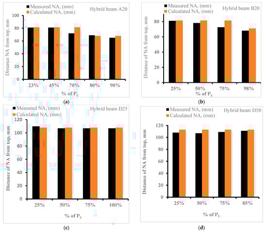 Strain developed in the NC-UHPC hybrid beams was measured by strain gauges attached at the top and bottom and two gauges attached on the sides of the beams, as shown in Figure 3b. The strain gauges were attached at the mid-span of the hybrid beam. The measured strains are used to find the depth of the neutral axis of these beams. Data for two sets of hybrid beams specimens, A20 and B20, of the same thickness of UHPC layer and different spans of the beams and D25 and D50 with of different thickness and same span are discussed here for brevity (other data are available with authors). The recorded values of strains at four different locations and at different levels of load are shown in Table 7 for A20 and B20 and Table 8 for D25 and D50. The measured and computed depth of the neutral axis for the four hybrid beam specimens are also shown in the tables.