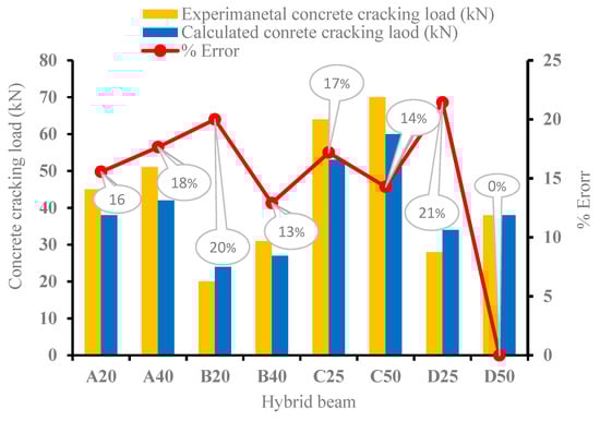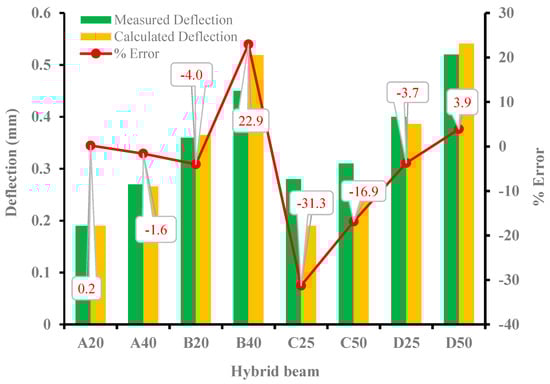 Figure 18 shows the average results of measured and computed deflections at the mid-span of all hybrid beams up to the concrete cracking load Pcr. By using a simple deflection equation under flexural loading, as shown in Equation (6), the calculated deflections were obtained.