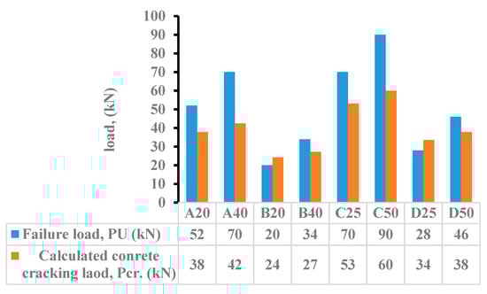 Experimental failure load (PU) versus the calculated cracking load (Pcr.).