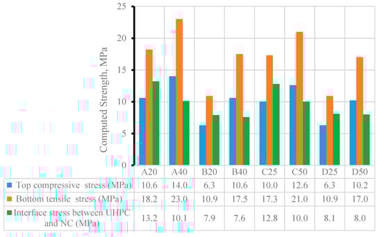 Figure 16 shows the stress in the hybrid NC-UHPC beams, computed at measured cracking load using the NA and MI computed earlier. The tensile stress in the UHPC layer varies between 17.0 MPa and 23.0 MPa (at the bottom) and 7.6 MPa and 13.2 MPa (at the interface). The compressive stress in the NC layer varies between 6.3 and 14 MPa. The tensile stress in the UHPC layer increases when the thickness is doubled. For Groups A and C, with an a/h ratio of about 1.5, the stress in UHPC at the bottom increases by 21 and 26%, whereas for Groups B and D (a/h = 2.4), it increases by 56 and 60%. The compressive stress also showed a similar enhancement when the thickness of the UHPC layer doubled.