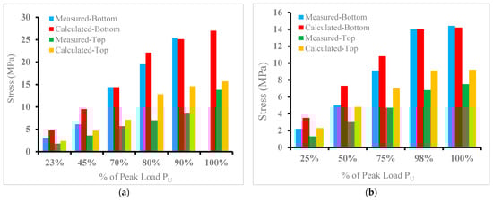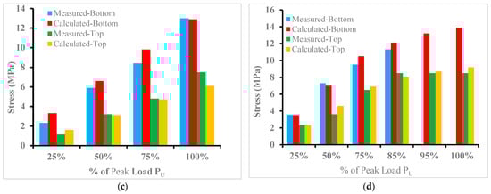 In general, the hybrid beam section is considered a cracked section as soon as the tensile strength of the UHPC layer at its bottom face goes beyond the computed tensile strength of the NC, as discussed in the previous sections. The comparison between the theoretical results calculated using a simple bending equation with the measured stresses from strains for the specimens A20, B20, D25, and D50 are presented in Figure 17. The flexural tensile stress at the bottom side of the hybrid beam was calculated with an elastic modulus of UHPC (Euc) of 55 GPa, while the compressive strain at the upper layer of NC was changed to stress by using the modulus of elasticity of NC (Enc) of 30 GPa (Table 5). At a smaller level of load, P < Pcr., the stresses in the hybrid beam were evaluated by using an uncracked beam section, whereas the cracked beam section was used for computing the stresses at load level, P > Pcr. (Table 6). Figure 17 shows a comparison of the calculated and measured stresses at the top and bottom of hybrid beams for different load levels up to 100% of failure load for the selected hybrid beams. The figure also demonstrated that, at all levels of load, the computed stresses are reasonably close to the stresses from the measured strains values, with the exception of some differences close to the ultimate failure load due to the nonlinearity that occurs close to failure load.