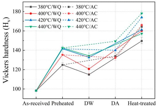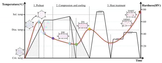 - The hardness bore an upward trend during the processes from preheating, deformation and cooling, to final heat treatment. In addition, dispersoid strengthening dominated the hardness variations on the cooling process. As a result, increasing the starting cooling temperature and decreasing the cooling rate allowed more dispersoids to precipitate, thereby enhancing the hardness of the alloy.