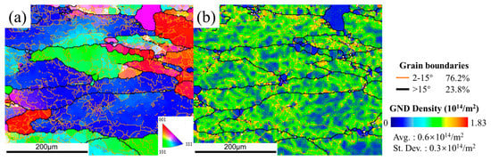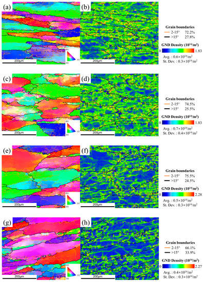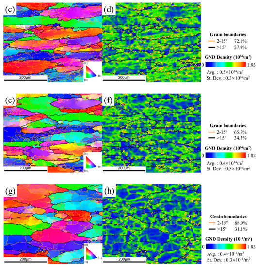 - The variation of recrystallization fraction before and after heat treatment was strongly dependent on the post-deformation cooling path. Higher volume fraction of recrystallized grains was usually obtained in the material slow cooled after deformation. Exceptionally, extremely high recrystallization fraction of 43.8% was obtained in the DWHT sample corresponding to 380 °C, due to the occurrence of abnormal recrystallization.