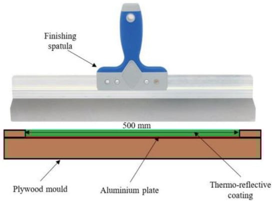 For the thermal transmittance experiment, two aluminum plates of exact size and thickness (500 mm × 500 mm × 2.05 mm) were used. The first aluminum plate was used as a reference. On one side, it was covered by a paper tape to prevent the high infrared irradiation reflectance of the bare aluminum surface. The second aluminum plate was covered with a layer of about 4.50 mm of thick thermo-reflective basic coating (Figure 1). Both plates were tested under the following conditions.