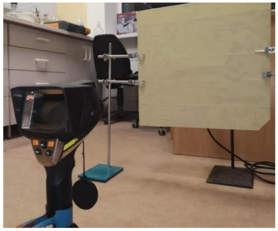 The aluminum plate was mounted on two stands, ensuring a 90° angle against the floor. As a heat source heat gun (STEINEL HG 2320 E) with a 9 mm inner diameter tip was used. The airflow settings of the heat gun were preset to 250 °C and 50% airflow intensity. The heat gun was mounted on a stand, ensuring a 20 mm distance between the tip of the heat gun and the aluminum plate’s bare side (Figure 2). To detect thermal transmittance, a thermal imager (testo 880, infrared lens 32°10 mm f/1.0, Sparta, NJ, USA) was mounted on a tripod directed straight at the opposite (covered) side of the aluminum plate, ensuring 70 cm distance between the plate and the lens. The test was performed by switching on the heat gun and taking thermal images every 30 s for 5 min. The thermal images afterwards were processed using IRSoft 4.6 software to determine the hottest spot and average temperatures of both plates during the heating.