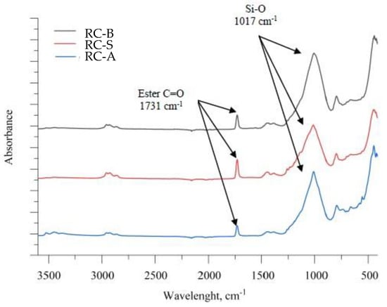 The FTIR spectra of the samples RC-B, RC-S and RC-A are depicted in Figure 3. The absorption maximum at 1731 cm−1 represents ester C=O stretching, which refers to acetate ester groups in poly(vinyl acetate) polymer. The highly intensive absorption maximum at 1017 cm−1 is characteristic for the Si-O stretching vibration, referring to silicon dioxide, which is the main component of coatings. The described peaks are the most intense and come from the basic components found in all the pastes described, therefore there are no significant differences between the analyzed coatings.