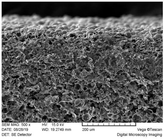 The measurements of the thermal conductivity were carried out 7 days after the preparation of the thermo-reflective coating samples. The previous analysis showed that thermal conductivity of samples stabilizes after 3 days of drying. In addition, it was observed that the thickness of the prepared samples significantly influences the value of the thermal conductivity. If the thickness of the sample is thinner, the thermal conductivity is lower. The figure below (Figure 4) shows a SEM photo of an exemplary cross-section of thermo-reflective coating. The photo shows that the structure of the coating is homogeneous throughout the cross-section.