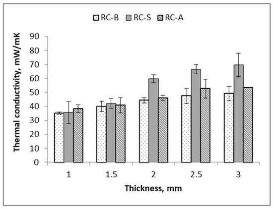 The most favorable values were obtained for a thickness of 1 mm, for which the thermal conductivity was approx. 34 mW/m·K for the RC-B coatings. While for the 3 mm thick sample, the thermal conductivity was approximately 50 mW/m·K. The self-extinguishing coatings had the highest thermal conductivity among the analyzed coatings. For the thickest 3 mm sample, the value of the thermal conductivity was approximately 70 mW/m·K, which was about 30% higher than in the case of RC-B and RC-A samples. For the thinnest samples, i.e., 1 and 1.5 mm, the values of the thermal conductivity are the same for all types of coatings at about 35 mW/m·K (Figure 5). The obtained values of the thermal conductivity coefficient for the analyzed coatings are promising compared to thermal insulation plasters used to face the problems of energy efficiency in construction available on the market, the value of which ranges from 55 to even 110 mW/m·K [28,29]. Bao et al. prepared polyacrylate/hollow spherical TiO2 composite film, the thermal conductivity of which even reached 200 mW/m·K [16].