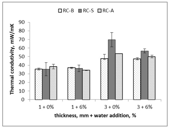 The thermal conductivity (after 7 days) of materials obtained with the pastes diluted by 2, 4 and 6% of water is shown in Figure 6. It was observed that the addition of water did not change the value of the thermal conductivity. Only in the case of the RC-S coating sample with a thickness of 3 mm, was a favorable decrease in the value of the thermal conductivity observed.