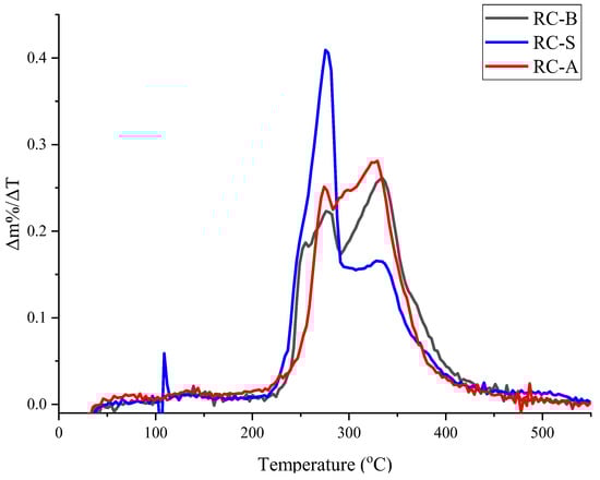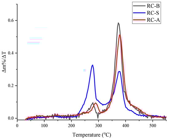 The comparison of the obtained results in an inert and air media (Figure 8) reveals that the first step of thermal degradation is more expressed in air media, indicating oxidative degradation beside deacetylation. Additionally, it can be seen that the first and the second degradation steps in the air are converging and less distinctive for all coatings. Both oxidative degradation steps for RC-S coating occurs within a temperature range of 215–430 °C, for RC-A coating within 220–430 °C and for RC-B within 225–435 °C. It is noticeable that the presence of air decreases the onset temperature RC-A and RC-B coatings by 20–30 °C. For RC-S coating, the onset temperature remains unchanged.