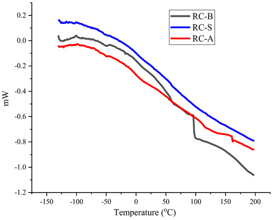 DSC analysis is a widely used technique for the structural investigation of different polymeric materials. The sample RC-B of thermo-reflecting coating had the lowest glass transition (Tg) temperature (Table 3), followed by the RC-A sample of thermo-reflecting coating. No thermal transitions were detected for the sample S of thermo-reflecting coating. This may indicate some molecular bond formation between the B coating formulation and the additives that provide the anti-corrosiveness and self-extinguishing. There were no thermal transitions in the negative temperature region (Figure 9), indicating that materials are suitable for use in cryogenic temperatures.