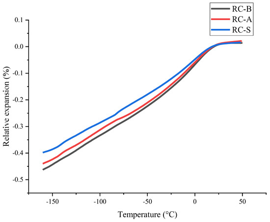 The principle of the dilatometry method is to measure the materials volume variation as a function of the temperature change. Dilatometry was applied to evaluate thermo-reflecting coatings properties, such as relative expansion and coefficient of thermal expansion (CTE) (Table 4). As the temperature decreased, all three samples shrank. The RC-S had slightly lower relative expansion and CTE than other coatings (Figure 10). It could be related to changes in the coating’s formulation. Thermo-reflecting coatings’ relative expansion and CTE were lower than for polyurethane foam (Figure 11). This can help reduce multi-layer cryogenic isolation expansion/contraction as the temperature changes.