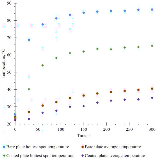 A test quite often used in the analysis of reflective coatings is the measurement of the temperature of the irradiated surface. The purpose of using thermo-reflective coatings is to reflect the radiation and thus lower the temperature on the building surface and inside [29,30]. From the acquired thermal image data, it can be seen that the thermo-reflective coatings have a considerable influence on the heat transport. The hottest spot on the uncoated aluminum plate after 5 min of heating reached 86.3 °C, while the plate with the 4.5 mm thick thermo-reflective B coating reached only 65.3 °C, thus proving the thermal insulating properties of the thermo-reflective coating (see Figure 12).