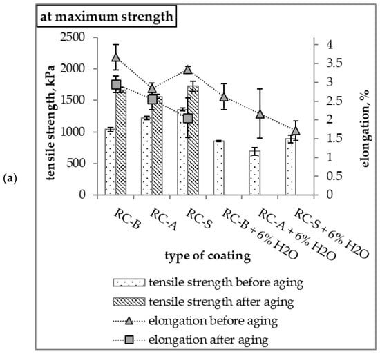 The RC-S coating had the highest tensile strength. The RC-A coating with water addition was characterized by the lowest maximum stress and the lowest stress at rupture. Materials with 6% water addition had lower strength than coatings without water addition. The introduction of water into the thermo-reflective compositions resulted in a reduction in elongation at maximum stress and a reduction in the elongation at break of coatings compared to non-water based materials (Figure 14). The value of Young’s modulus for the coatings was similar, except for the S coating with the addition of water, the modulus of which was much higher (Figure 15).