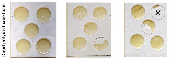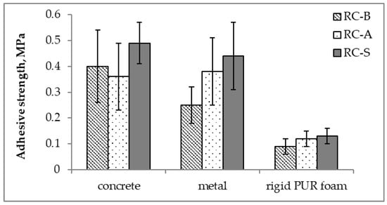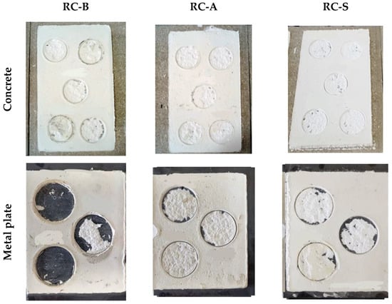 During the test, it was observed that the breaking of the coatings on the concrete surface always took place inside the coating (cohesive crack 1). In the case of using a metal plate, the peeling of the RC-B coating was observed at the joint with the metal plate (adhesive crack), while RC-A and RC-S coatings were torn inside the coating (cohesion crack 1). The peeling of the RC-B coating from the polyurethane foam took place at the contact of the surface with the coating (adhesive cracks), while the RC-A and S coatings caused cracks in the material substrate. The Figure 19 shows the appearance of the surface after the pull-off test.