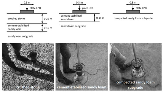 The test with a light dynamic plate (LWD) consists of inducing the appropriate stress in the tested layer and recording the response—displacement within about 20 ms. The mass freely falling from a predetermined height hits the damping system, which deforms and smoothly transmits the load impulse to the pressure plate. The plate, in turn, causes a vertical displacement (deflection) of the subgrade, which is registered by a special sensor, called a geophone. More details on geophone operation can be found in [27]. Two plates with a diameter of 0.3 m were used for the tests, differing in the size of the freely falling mass and the drop height. In the case of the first plate, the pressure on the subgrade was 0.1 MPa, and in the case of the second—0.15 MPa.